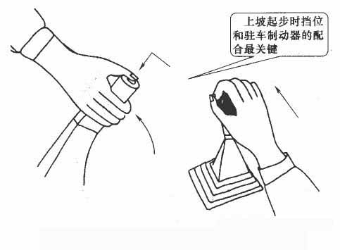 (1)听到“上坡定点停车”指令后,立即开启右转向灯,方向向场地右侧靠。起步时如果有坡度,为防止溜坡,要用半坡起步法起步。